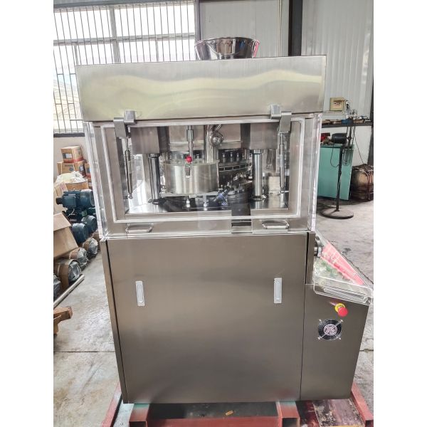 The machine is a double-pressing automatically revolving piece-pressing machine which could make grain be pressed to be round piece, be carved characters, special shapes and double color piece prescription. It is mainly used in manufacturing piece prescription for pharmaceutical industry enterprises like chemical industry ,foods, electronics .(Note: when manufacturing double color piece ,it only need replacing components and adding powder absorbing apparatus which greatly lowers the cost and raises profit .)
